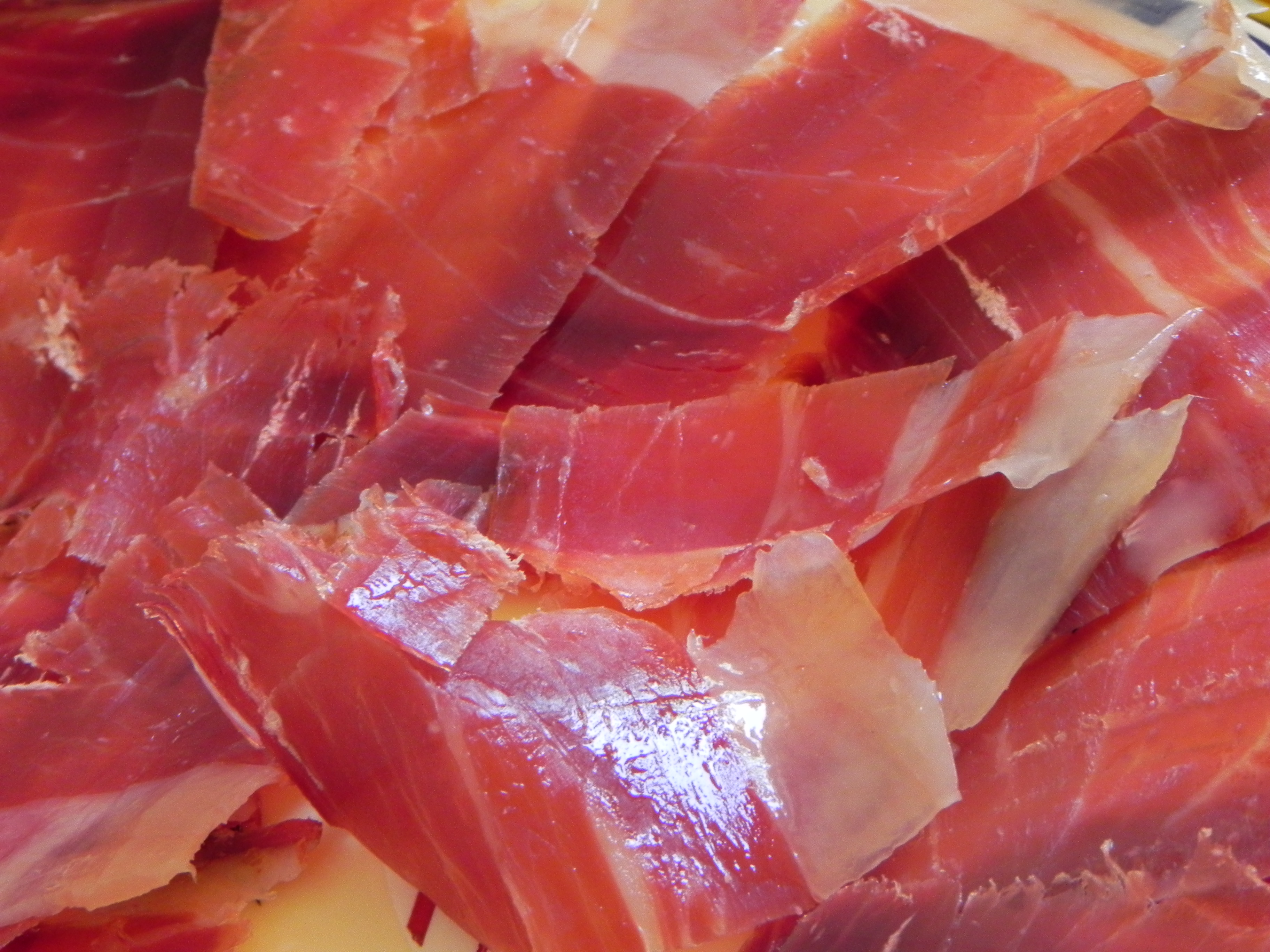 En effet, les cochons peuvent se nourrir d´herbes et de glands qu´ils vont trouver dans les collines d´Estrémadure. La qualité des jambons dépendra alors de leur espace vital, de la qualité de la nourriture qu´ils vont recevoir au cours de leur vie mais aussi et avant tout du croisement duquel ils sont issus : un bon jambon Iberico provient de la race pure ibérique ou bien d´un croisé Duroc-Jersey avec 75% de sang ibérique. L´organisme des Pata Negra permet une infiltration de la graisse présente dans les glands mangés dans les tissus musculaires ce qui explique que le jambon soit assez gras. Les espagnols mangent le gras et le maigre contrairement à ce que nous pouvons faire avec un jambon de Bayonne par exemple. Ici, tout se mange !